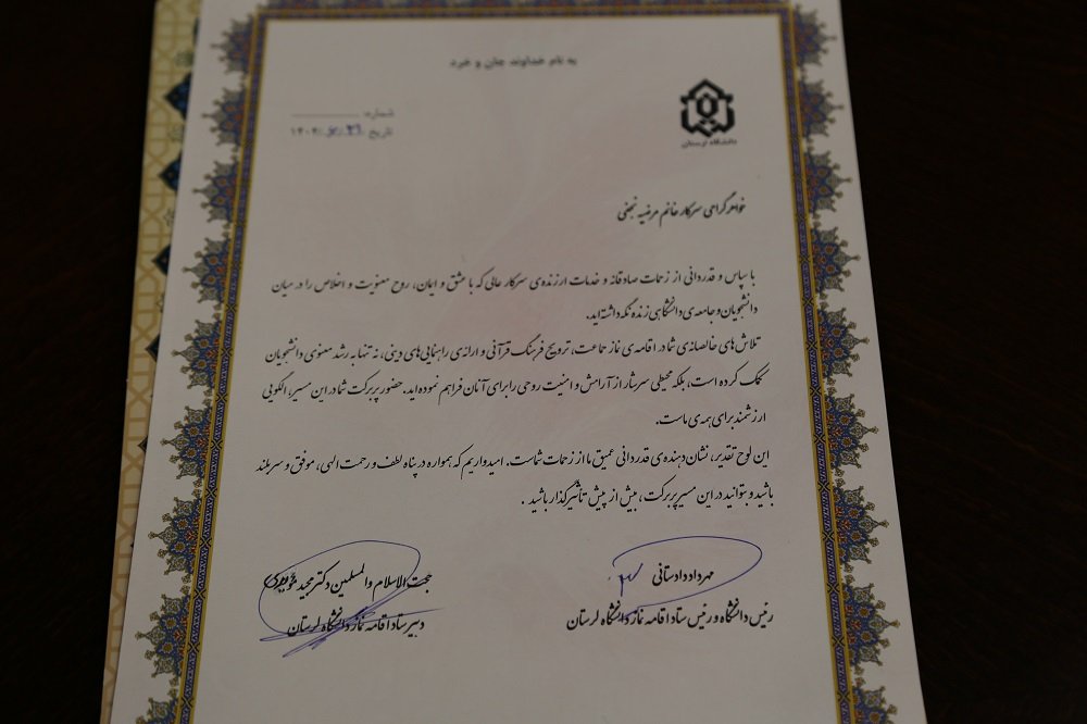 تجلیل از مسئول واحد خواهران نهاد رهبری دانشگاه لرستان در پاسداشت فرهنگ نماز